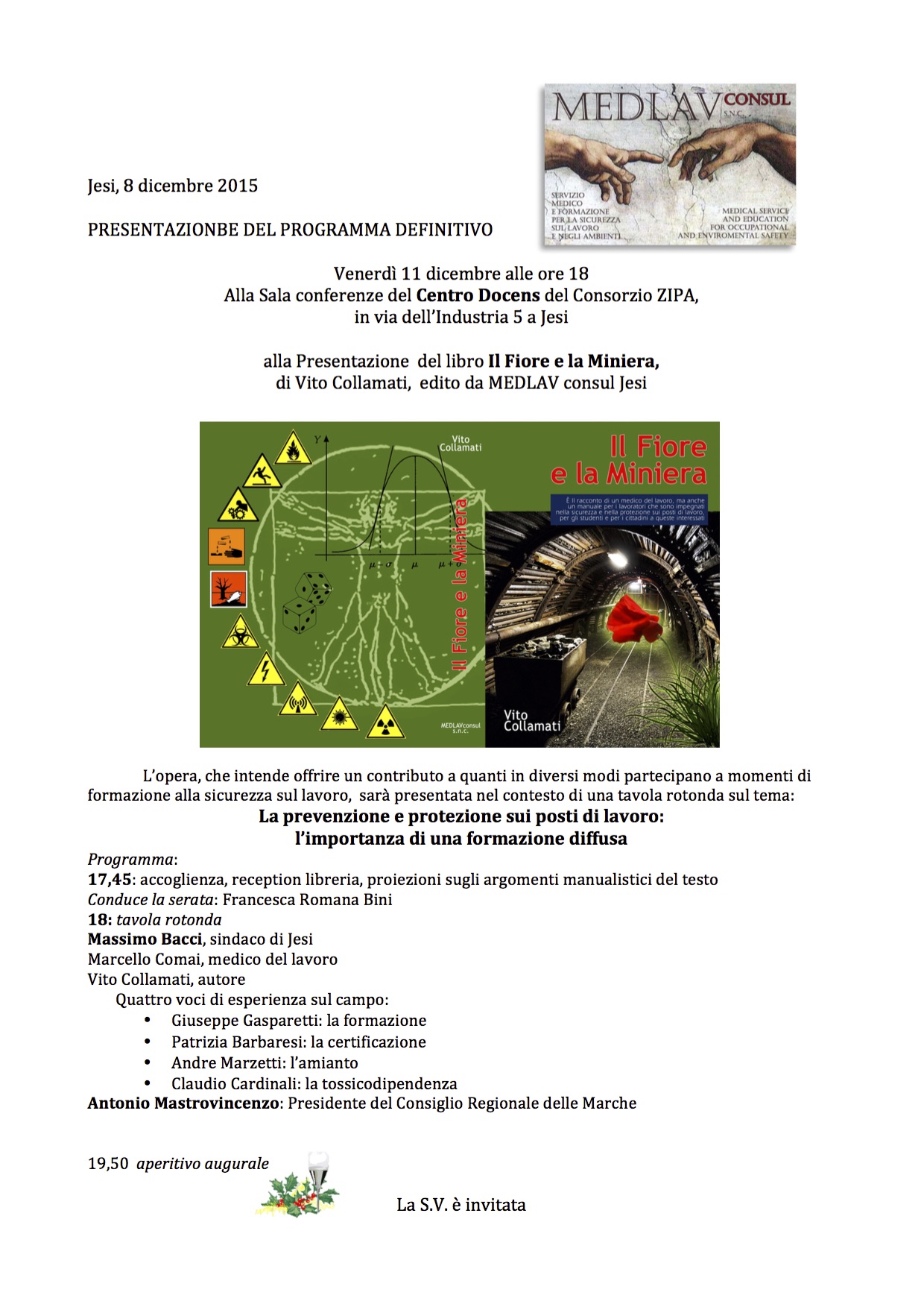 Venerdì 11 dicembre alle ore 18 presso la Sala conferenze del Centro Docens del Consorzio ZIPA, in via dell’Industria 5 a Jesi si terrà la presentazione del libro “Il Fiore e la Miniera”, del Dott.Vito Collamati, con la partecipazione del sindaco di Jesi Massimo Bacci e del Presidente del Consiglio della Regione Marche Antonio Mastrovincenzo.
